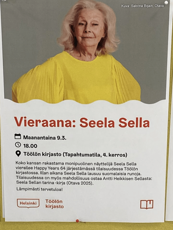 9.3.2026 klo 17.00 taiteilija Seela Sella on lupautunut pitämään Töölön kirjastossa kaikille avoimen runoillan.
